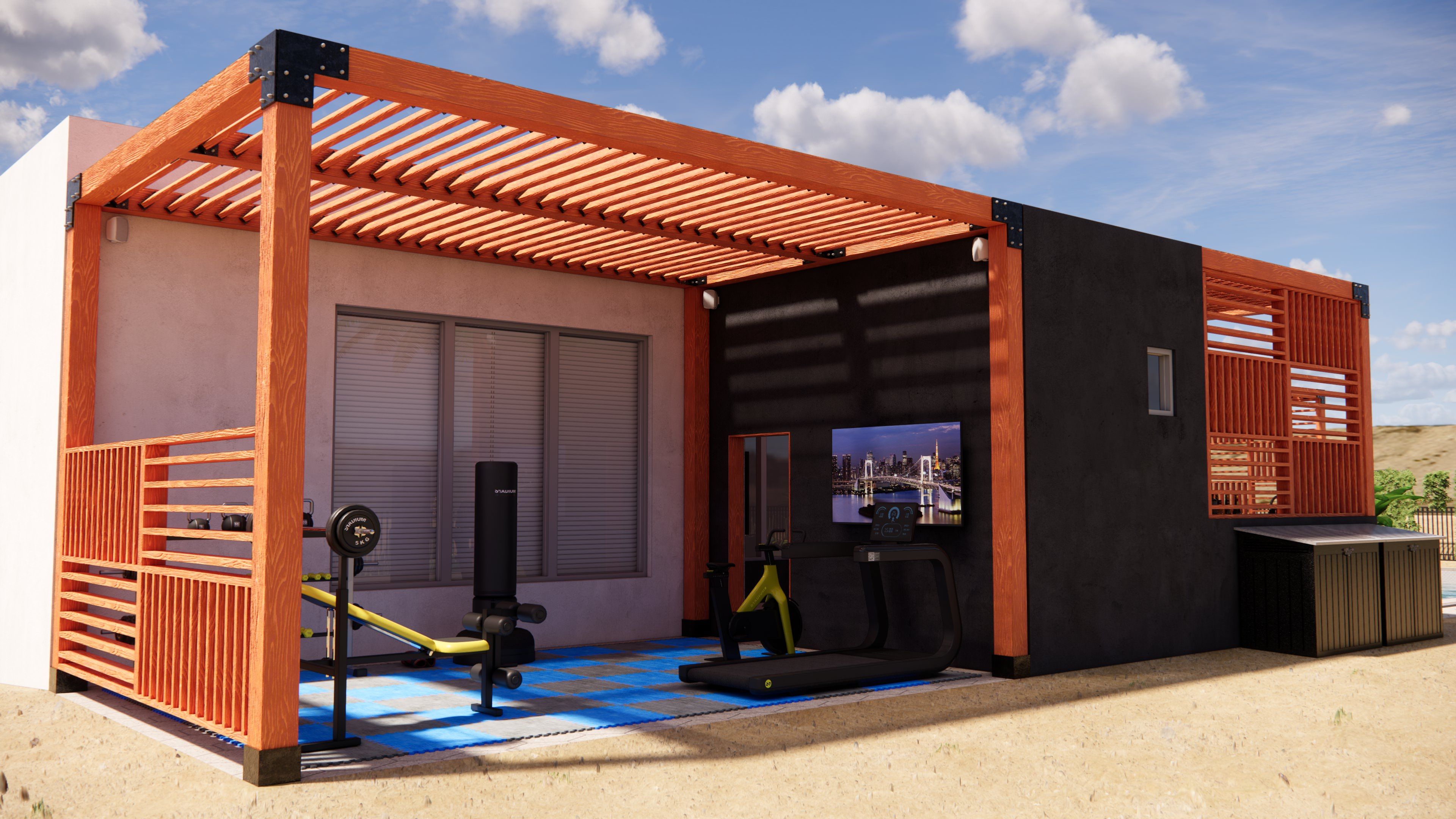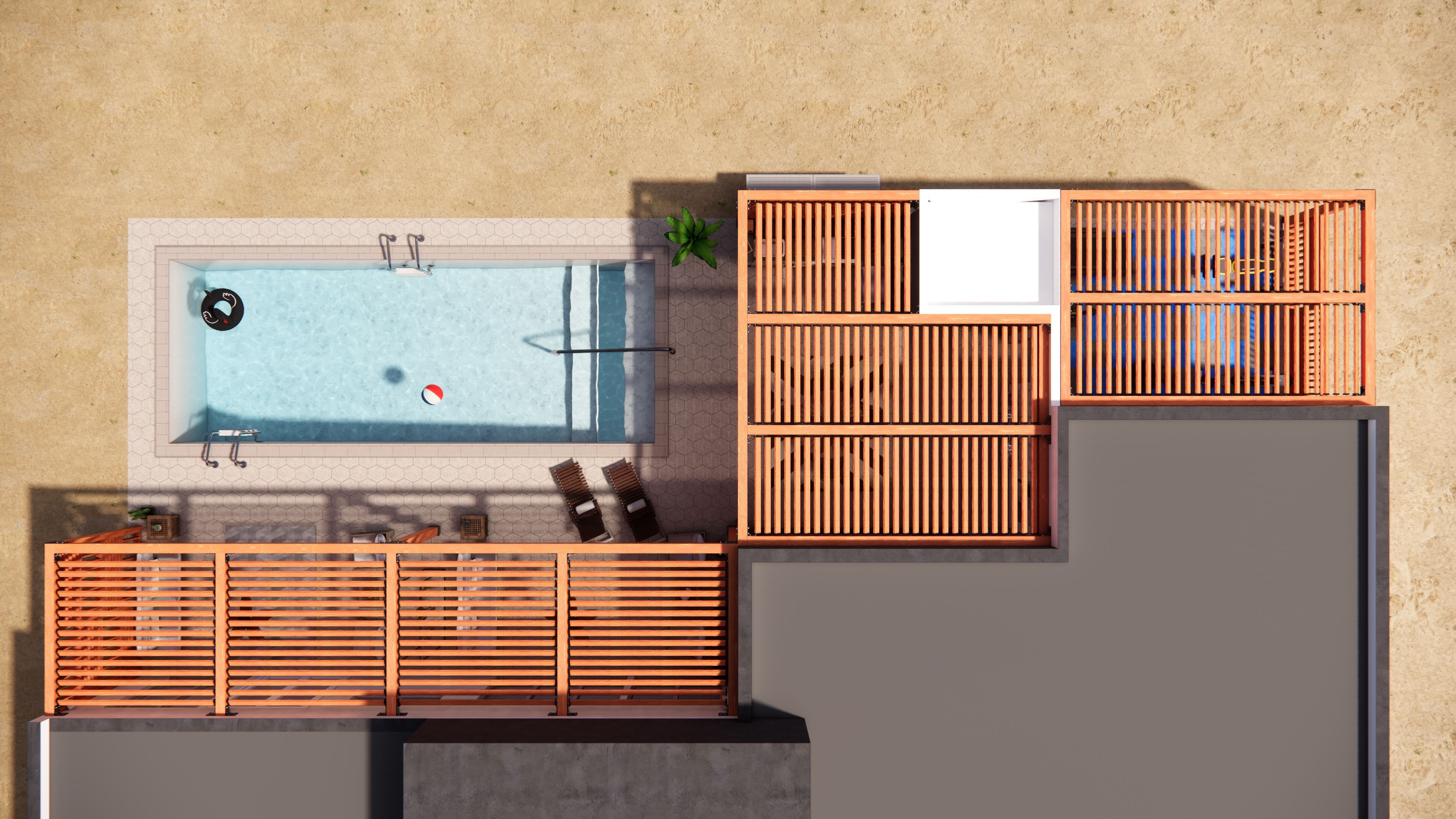 The client’s primary goal was to make the pool the focal point of the space, while also incorporating areas for gathering and relaxation, an outdoor kitchen, and an exterior home gym. DAE Group developed a thoughtful design that met all of the client’s needs within a compact footprint—creating clear separation between functional areas while maintaining a cohesive and inviting outdoor environment.